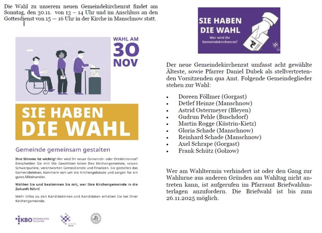 - 30.11. Wahl neuer Gemeindekirchenrat 24. Oktober 2025